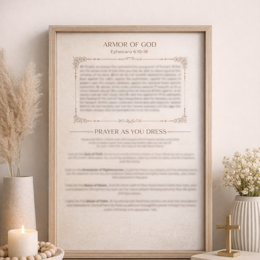 This printable was thoughtfully designed to sit on a dresser, nightstand, or prayer space as a daily reminder to begin the day covered in the Armor of God. Inspired by Ephesians 6:10–18, this piece pairs the scripture with a guided prayer to help center your heart and mind as you prepare for the day ahead.
